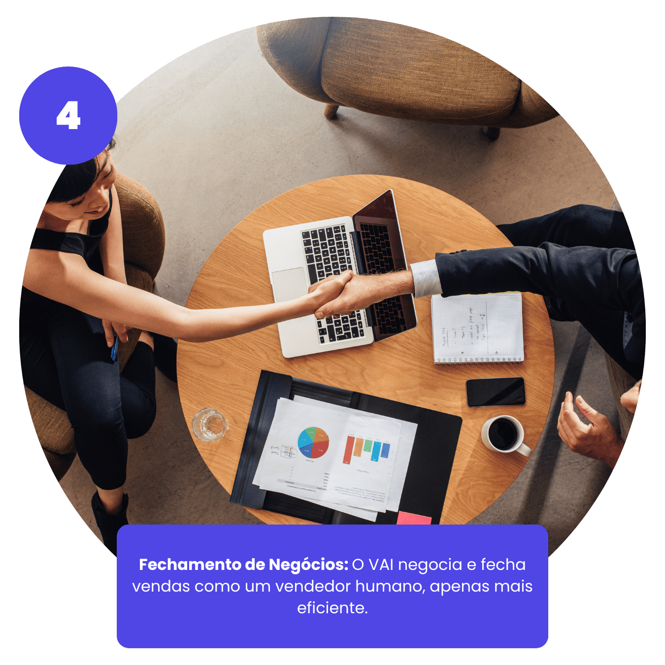 Nosso VAI responde dúvidas, negocia condições e fecha negócios a qualquer hora do dia.